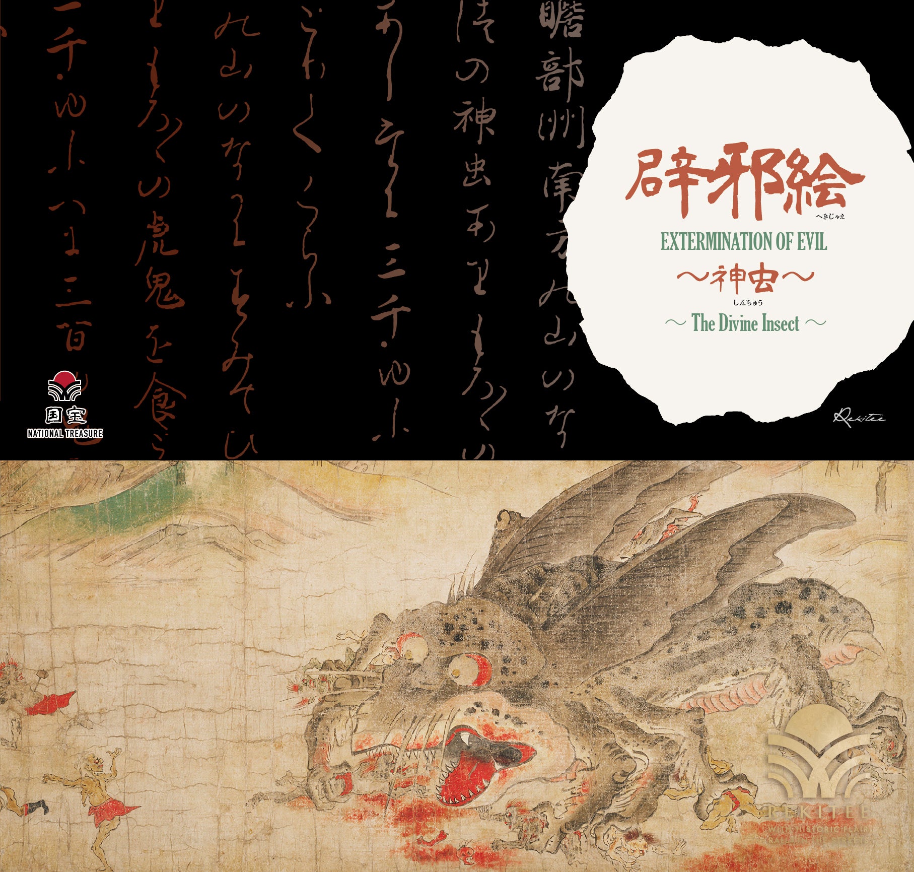 This artwork depicts Shinchū, who exterminates evil spirits that cause harm and illness. Thought to be a glorified form of the silkworm or an imagined being with features of spiders, dragons, and other creatures, Shinchū was said to devour 3,000 tiger demons in the morning and 300 at night. In this scene, skulls and flesh—likely from demons already eaten—lie scattered, while another demon struggles to escape its grasp.