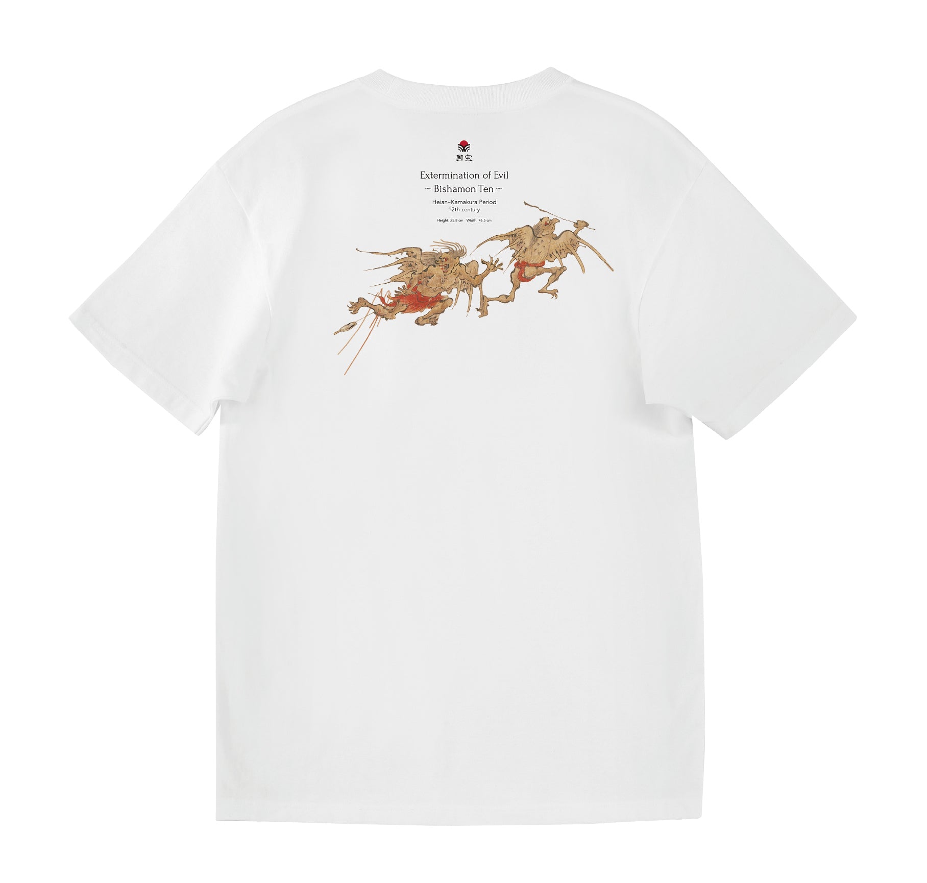 This artwork depicts Bishamon Ten, who exterminates evil spirits that bring harm and illness. A Buddhist guardian of the north, he is also revered in Japan as a god of war. In this scene, Bishamon Ten appears on a cloud and shoots arrows at two demons attempting to interrupt a monk’s training. The demons flee in panic, but one in the rear is struck by an arrow.
